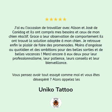 Chaque duo chien-humain est unique, alors on prend le temps de comprendre ce qui se passe pour vous proposer un accompagnement adapté. Réactivité, agressivité, peurs, hyper-attachement… On vous aide à retrouver une relation apaisée avec votre chien